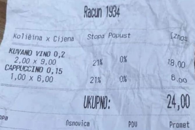 U konkretnom slučaju, kapućino je naplaćen 6 evra, odnosno oko 700 dinara, dok je čaša kuvanog vina koštala čak 18 evra, više od 2.100 dinara. To su iznosi koji ne odudaraju samo od prosečnih cena u regionu, već i od cena u pojedinim zapadnoevropskim turističkim destinacijama.