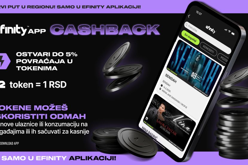 Korisnici eFinity aplikacije prilikom kupovine ulaznica za odabrane događaje ostvaruju povraćaj do 5 odsto vrednosti kupovine u vidu e-tokena, koji se automatski akumuliraju u eFinity Novčaniku. Na taj način publika ne samo da obezbeđuje mesto na željenom događaju, već ostvaruje realnu uštedu, čineći svaku narednu kupovinu dostupnijom i isplativijom.